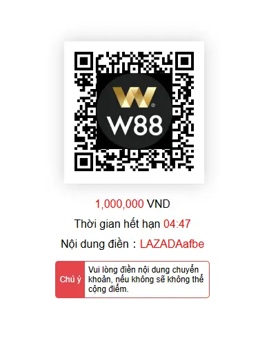 • Hệ thống sẽ hiển thị mã QR tương ứng với thông tin tài khoản ngân hàng của W88. (Lưu ý: Mỗi QR chỉ có giá trị sử dụng 1 LẦN DUY NHẤT).